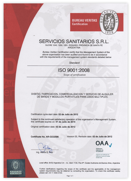Nuestra labor es realizada mediante estrictos controles de calidad, es por ello que en el año 2012 obtuvimos la certificación ISO 9001:2008 de Bureau Veritas.